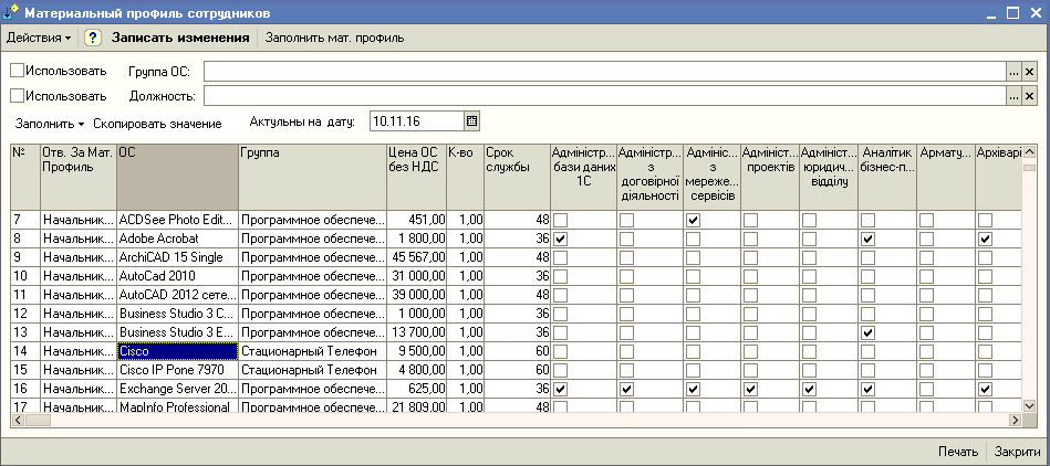 Обработка позволяет, отмечая галочками напротив группы ОС и должности, закреплять за ней данное ОС. Также в ней есть ограничение по должности, т.е пользователь может отмечать только те позиции, за которые он ответственен. Например начальник ИТ выбирает каким должностям полагается тот или иной тип компьютера или программное обеспечение, начальник отдела автотранспорта – автомобили и комплектующие.