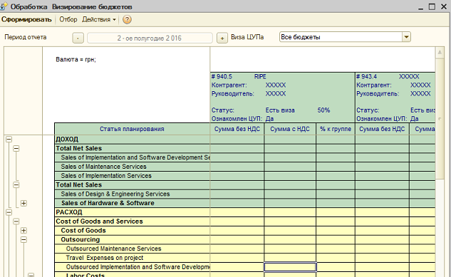 На основании этих документов создаются документы "бизнес планы подразделений", в которых по статьям доходов и затрат формируется сводный бизнес план. В документах фиксируется период планирования, вероятность, подразделение (ЦФО) и прочая аналитика (проект, должность, сотрудник, автомобиль). Документы можно создавать и заполнять вручную. Они проходят стадию визирования финансовым директором. Возможны и создание корректировок бизнес плана для более точного плана. Созданы документы, которыми можно формировать прогнозы выполнению бизнес планов - например если периодичность планирования полугодие, можно создать прогноз на второй квартал на основании фактических данных первого квартал и планируемых показателей из бизнес плана на второй квартал.